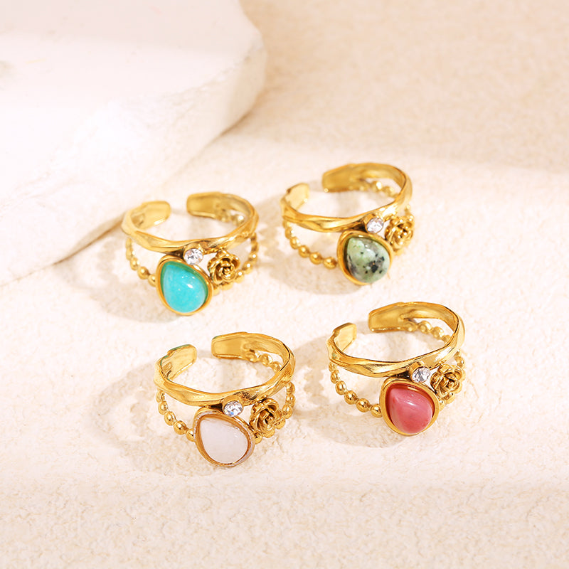 Bague dorée fleur strass et pierre goutte. Tous nos produits sont fabriqués en acier inoxydable, un matériel qui résiste à l'eau et ne se rouille pas dans le temps. Ils sont garantis sans nickel, sans cadmium et sans sel de plomb.