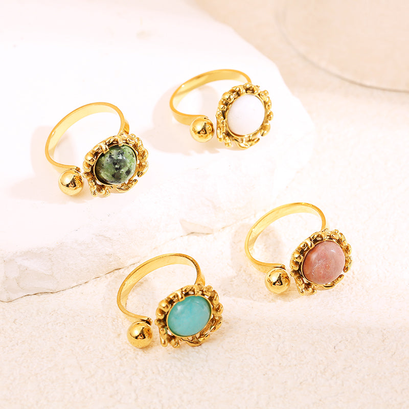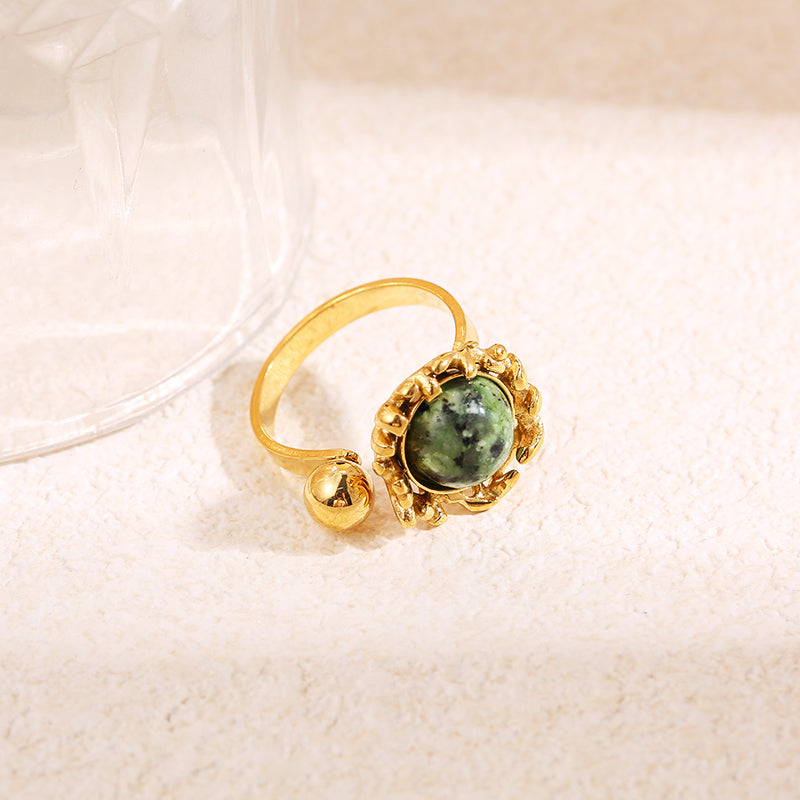 Bague dorée ouverture devant boule avec pierre. Tous nos produits sont fabriqués en acier inoxydable, un matériel qui résiste à l'eau et ne se rouille pas dans le temps. Ils sont garantis sans nickel, sans cadmium et sans sel de plomb.