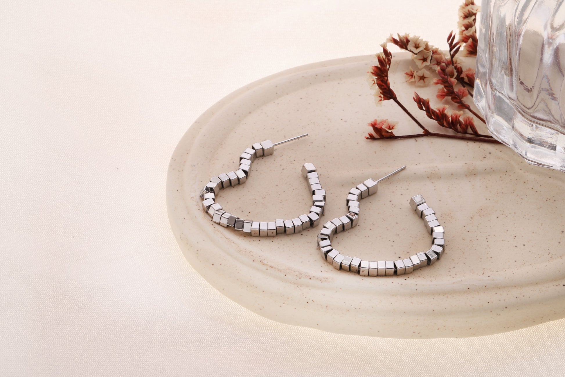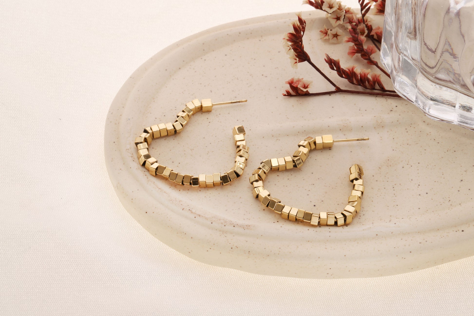 Boucles d'oreilles créoles ouvertes ornées de cubes. Tous nos produits sont fabriqués en acier inoxydable, un matériel qui résiste à l'eau et au temps, ils sont garantis sans plomb, sans nickel et sans cadmium.